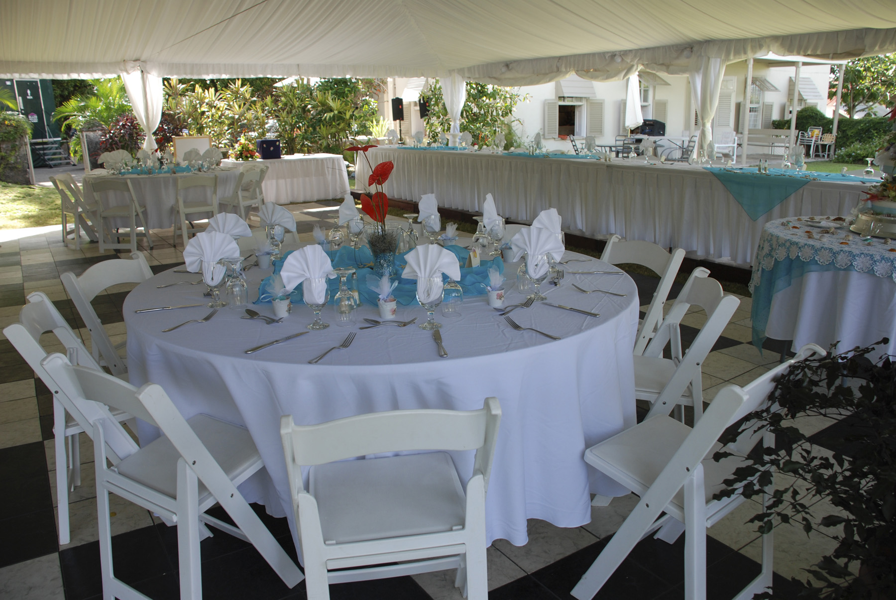 Table linen available in 108" round for a floor length drop on a 48" round table or a half drop on a 60" round table. Also 90" round linens for a half drop on a 48" round table. These linens available in white, black, ivory and various other colours.